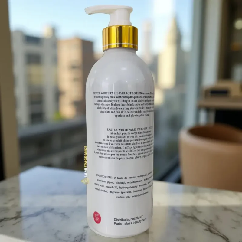 Faster White Carotte Whitening Body Milk nourishes and enhances the skin, improving both complexion and texture. Features a special emollient that deeply moisturises the skin, along with plant extracts like carrot oil and vitamin E that lighten and repair dull skin.
