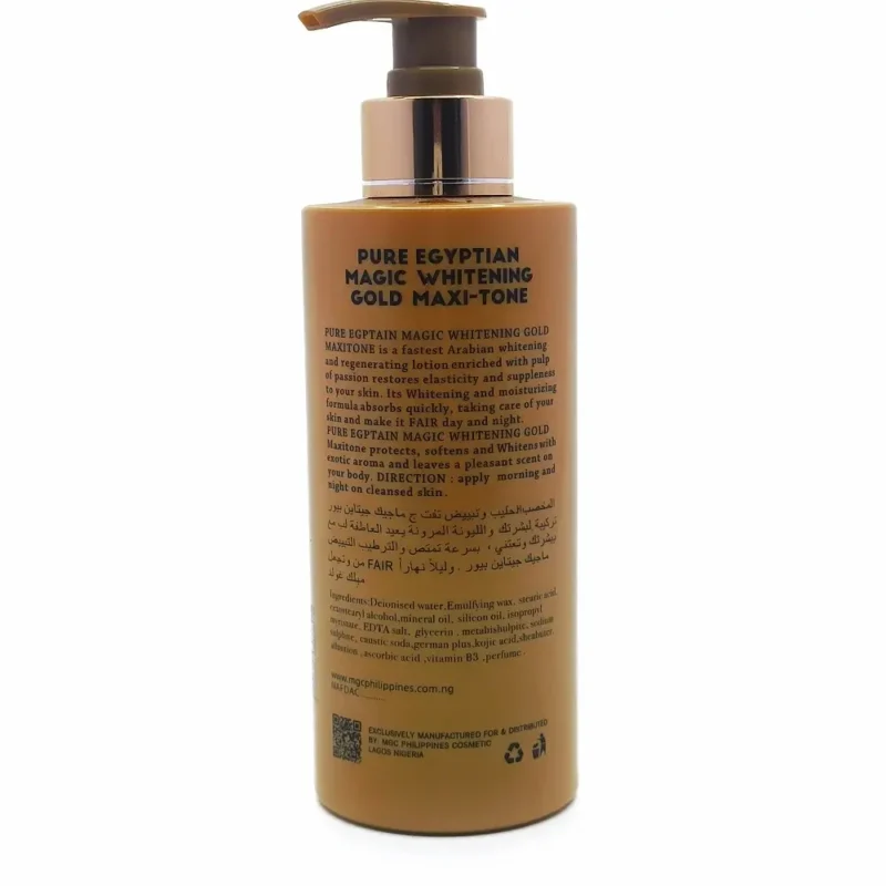Pure Egyptian Magic Whitening Gold Maxi-Tone Lotion works as an extra whitening body lotion for everyday fairness. Enriched with 2% Alpha Arbutin Oil extract, Kojic Acid and Shea Butter, this Arabian body lotion moisturizes and whitens the skin while leaving a pleasant scent on your body.