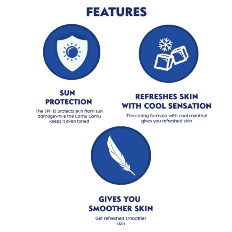 Nivea Whitening Cool Sensation Body Lotion SPF 15 gives you a brighter, even-toned complexion with a cooling effect. This Nivea Body Lotion is formulated with camu camu extracts and contains a sun protection formula (SPF 15) to help keep your skin even in complexion as well as protect you from sun damage. Contains menthol to keep you fresh all day.
