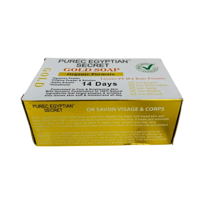 Purec Egyptian Secret Gold Soap is specially adapted for black and mixed skin and formulated from 100% natural plants to lighten and firm the skin. It treats and eliminate pimples, dark spots, sun spots, wrinkles to regain clear, smooth and clear skin. In addition, it is enriched with sweet almond oil and vitamin E to moisturize and protect the skin.This extremely thorough formula has been developed by highly qualified laboratories.