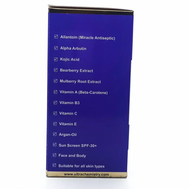 De-ionized Water, Allantoin, Argan Oil, Vitamin B3, Bearberry Extract, Kojic Acid, Alpha Arbutin, Cetearyl-Alcohol, Glycerine, Ascorbic Acid (Vitamin C), Dimethicone, Vitamin E, Vitamin A, Sunscreen (SPF-30+), Glycerin Stearate, Stearic Acid, Shea Butter, Disodium EDTA, Citric Acid Fragrance and more